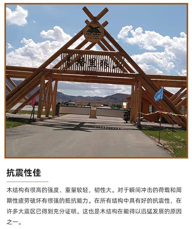 • 木結構有很高的強度、重量較輕,韌性大。對于瞬間沖擊的荷載和周 期性疲勞破壞有很強的抵抗能力。在所有結構中具有好的抗震性,在 許多大震區已得到充分證明。這也是木結構在能得以迅猛發展的原因 之一。